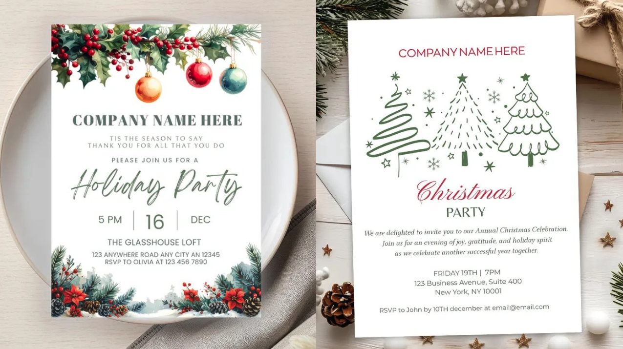 The invitation sets the tone for the entire event. Corporate offices need invitations that communicate professionalism first, celebration second. Clean typography, neutral backgrounds, subtle winter elements, and structured layouts work far better than loud colors or playful icons. These invitations often double as digital assets, so clarity and polish are critical.