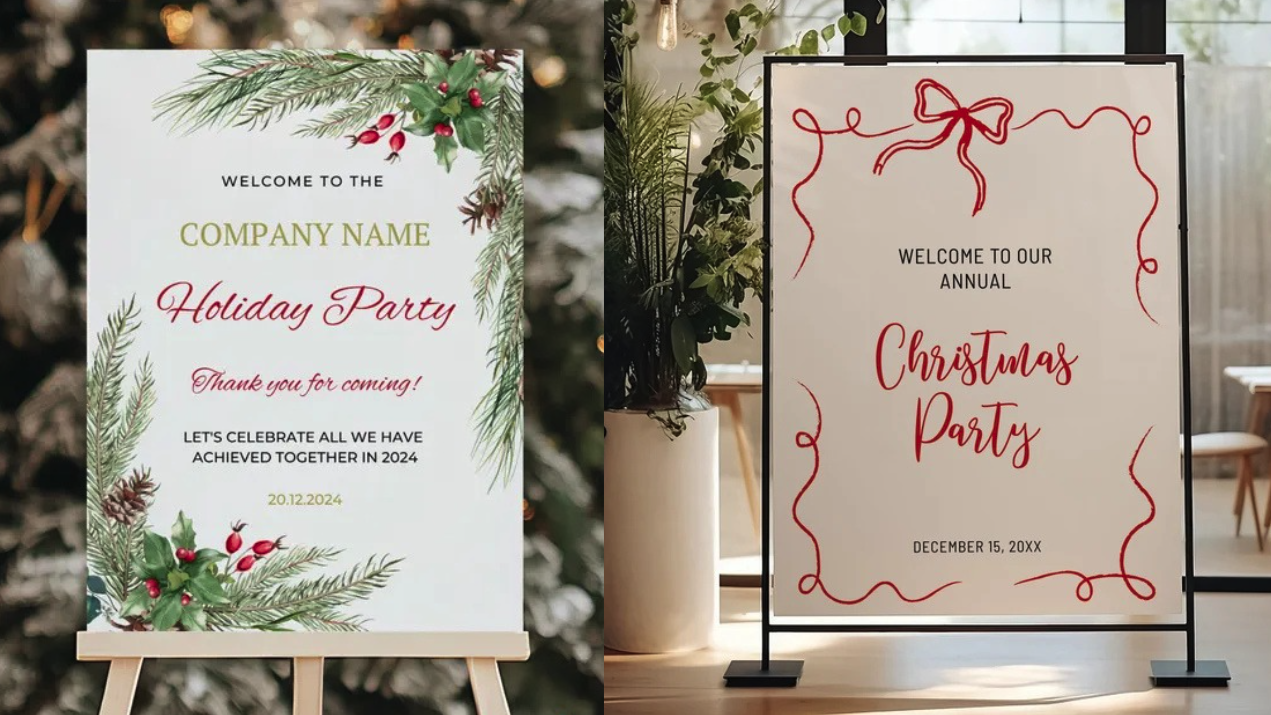 Offices hosting holiday parties frequently need signage: welcome signs, directional posters, or simple event branding. These pieces help the event feel organized and intentional. Minimal layouts, strong hierarchy, and subtle seasonal details ensure the signage feels festive without overwhelming the space.