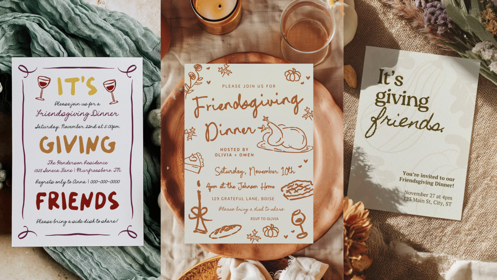 When developing design ideas for Friendsgiving, focus on details that create emotional connection. Handwritten fonts or elegant serif typefaces feel personal and timeless. Subtle illustrations—leaves, branches, or candles—add charm without overwhelming the layout. Think less about perfection and more about warmth.