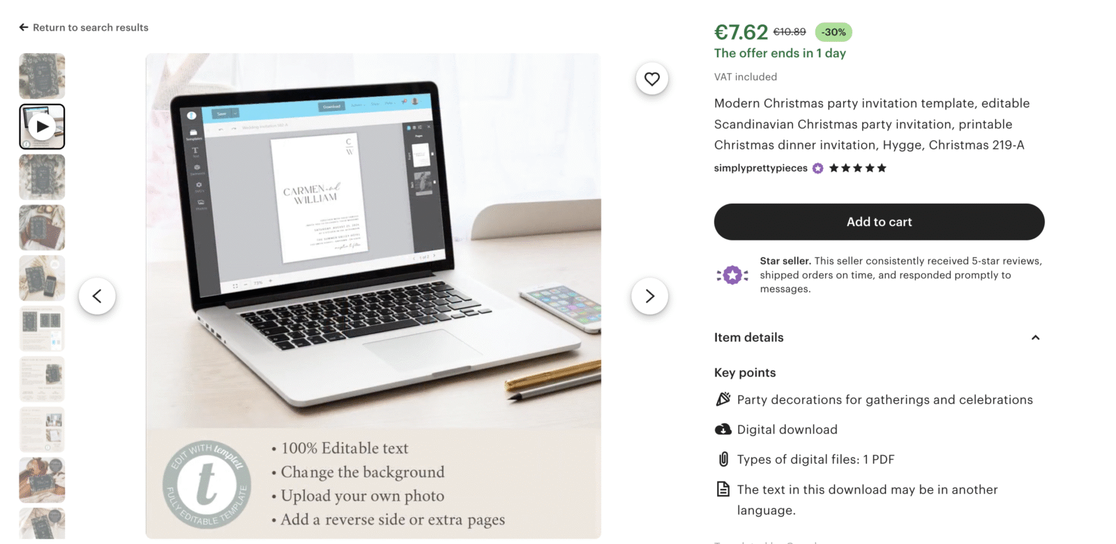 Printable templates continue to perform exceptionally well because they’re quick to produce and easy for buyers to customize. Think menus, labels, and event signage. These items allow hosts to coordinate every detail of their gatherings.