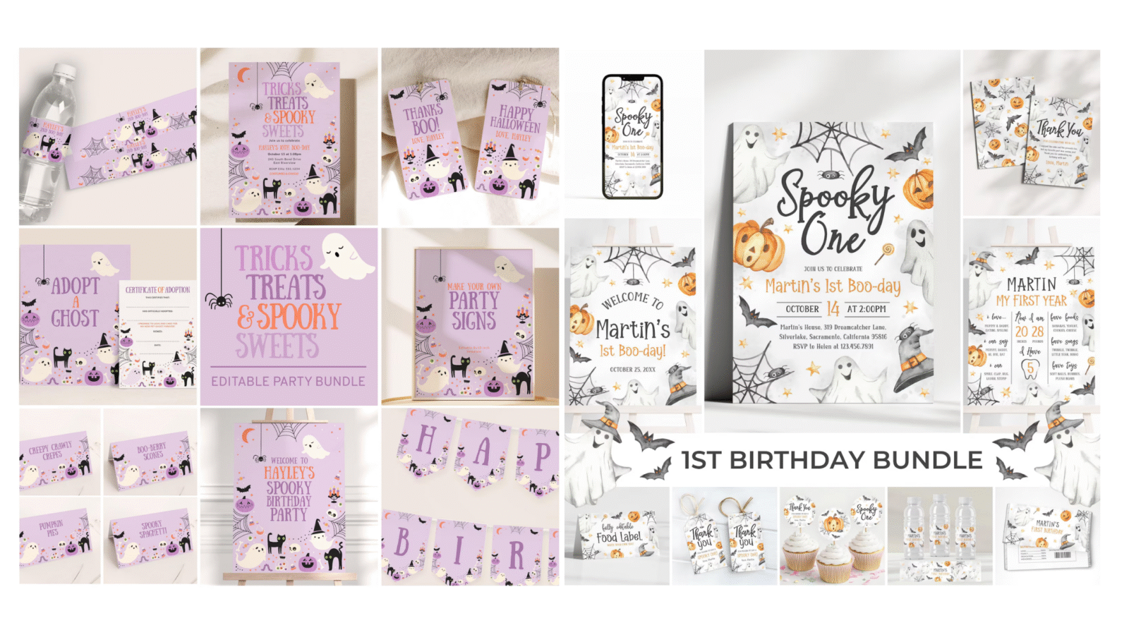 Parents love that this theme feels festive without being too scary. Try designing matching items like milestone signs, cupcake toppers, and favor tags to create a full “Little Boo” collection. Bundles like these are great for increasing your shop’s average order value and making your listings stand out on Etsy.